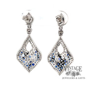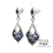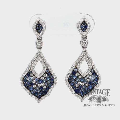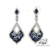 Ladies 14 karat white gold pave' blue sapphire and diamond drop earrings. The earrings have diamonds interspersed with the blue sapphires in a trapezoid shape and and are suspended from a diamond shaped sapphire halo stud.. The round sapphires have a total weight of 0.97 carats and the diamonds have a total weight of 0.76 carats.