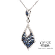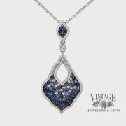 Ladies 14 karat white gold pave' blue sapphire and diamond pendant The pendant consists of a diamond halo bordered, pave sapphire, scattered diamond main bottom section, set in an undulating diamond shape. The pendant is suspended from a pave' sapphire with diamond halo detached bale. Pendant is on an open rope chain.