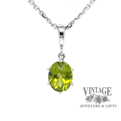 View full detailsThis checkerboard cushion cut natural peridot weighs .97 carats, and is set in a 14 karat white gold pendant topped by a single round brilliant cut...