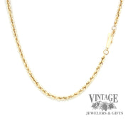This 21” 2.5mm 14ky gold rope chain is made from solid gold and finished with a high-gloss shine. Its classic design ensures a timeless look, while its 2.5mm width adds a luxurious feel. This rope chain is crafted from 14 karat yellow gold for a look that is sure to impress. It is secured with a yellow gold barrel clasp.