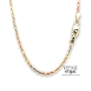 This multi-purpose chain in 14 karat multi color gold can be worn alone or with your favorite multi-color gold pendant. The chain is 22" in length and measures 2 mm in diameter. The chain is secured with a lobster clasp and 2 tabs.