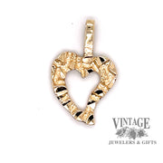 A stylized 14 karat yellow gold heart charm, it has a diamond cut nuggety texture. It can be worn as a pendant or on a charm bracelet.
