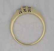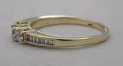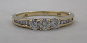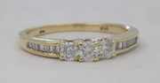 Ladies 14k yellow gold diamond band with 3 round center diamonds and channel baguette diamonds in shank. Three round diamonds with total weight of 0.30 carats and 14 baguette cut diamonds for total weight of 0.20 carats. All diamonds average I1. goods.