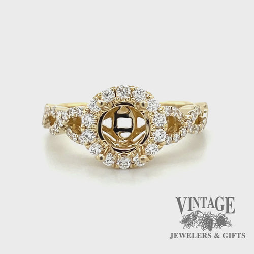 This stylish 14 karat yellow gold sparkling diamond ring is designed to hold a 6-6.5 mm round center stone and provides the perfect backdrop for the diamond or gemstone of your choice!  A total of 58 round brilliant cut, SI clarity, near colorless, natural diamonds are featured in the halo and braided shank for a total diamond weight of .53 carats. The ring is size 6.75.