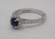 Platinum and diamond mounting with natural blue sapphire center stone. The halo mounting is by Tacori and the 39 VS diamonds weigh 1.01 carat while the blue sapphire weighs 1.12 carats. The ring is size 6.5.
