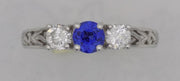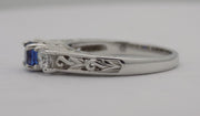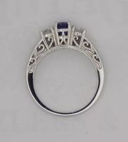 14 karat white gold 3 stone style ring. The center sapphire weighs 0.67 carats flanked by two SI diamonds totaling 0.47 carats. The mounting is a filigree double gallery style and is size 7.