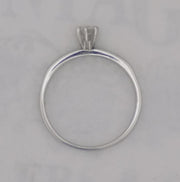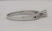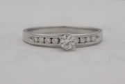 Ladies 14 karat white gold Estate diamond engagement ring. The ring has a single 0.15 carat J-SI round brilliant cut center diamond flanked on either side by 4 additional diamonds that are channel set with a total weight of 0.12 carats. All the diamonds are SI goods. The ring is size 6.