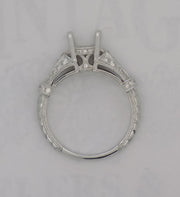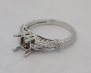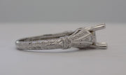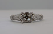 14 karat white gold diamond semi-mount for round brilliant cut diamond of a 1.25 carat s. The semi-mount contains a total weight of 0.25 carats set in the shoulders and gallery of the mount in a pave fashion. The shank has and engraved design. The ring is size 6.