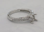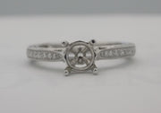 Estate 18 karat white gold diamond semi-mount engagement ring. The ring contains 9 round pinpoint diamonds bright cut into the filigree style shoulders of the shank as well as a slightly larger round brilliant cut diamond in a bezel setting at both sides of the base of the center head. The total weight of the VS diamonds is 0.22 carats. The ring is size 6.5.