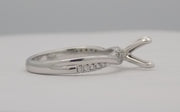 14 karat white gold diamond semi-mount. The mounting contains 8 small round brilliant cut diamonds flanking the center with a total diamond weight of 0.14 carats, Each side of the shank has a ribbon of white gold wrapping the shank. The ring is size 6.