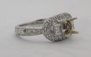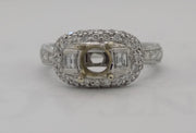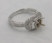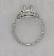 14 karat white gold vintage style diamond semi-mount ladies ring that will accommodate a 1-1/2 carat diamond. The mounting holds a single emerald cut diamond  on each side of the center stone as well as the pave' diamond encrusted halo top and the bright cut diamonds in the shank. The shank is also hand engraved on three sides.  The total weight of all the VS diamonds is 0.63 carats. The ring is size 6.5.