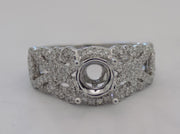 14 karat white gold pinpoint diamond semi-mount for 1 carat round brilliant diamond. The mounting has a series of intersecting curlicues as well as a partial halo holding 0.55 carats total of SI diamonds in a pave' style. The ring is size 6.