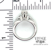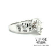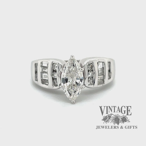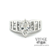 A .99 carat (estimated) scintillating marquise shaped natural diamond is highlighted at the center of this 14 karat white gold estate ring. The marquise diamond is a Color F/G (FL), Clarity I1, displaying eye visible feathers and crystals and is secured in a six prong head. The ring is channel set with an additional eighteen, I1 clarity, near colorless diamonds totaling .40 carats. It is currently a finger size 5.