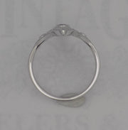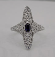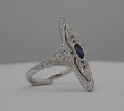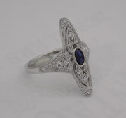 This 14k white gold ring has a 5 X 3 mm, oval shape, blue sapphire center stone, bezel set within a pierced elongated marquise shaped edwardian inspired ring design and bead set with .31 total carats of natural diamonds. The ring is now a size 7.