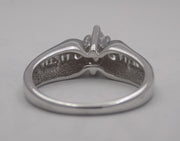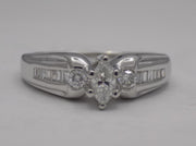 A modern style 14 karat white gold diamond engagement ring. The ring contains a single marquise shaped center diamond, flanked on either side by a single round brilliant cut diamond as well as 6 baguette cut channel set diamonds. The total approximate weight of all the diamonds is 1/2 carat and they are SI goods. The ring is size 6.