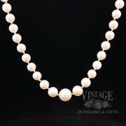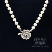 - Graduated pearl necklace with a Blue Sapphire accented rose clasp.