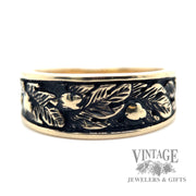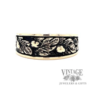 - Antiqued Oak Leaf design tapered gold ring band.