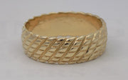 Man's 14 karat yellow gold Estate wedding band. The band is a half round, 7.5 mm in width and has a fluted diagonal honeycomb pattern with solid interior finish. Size 11.25.
