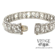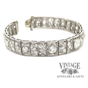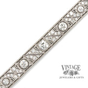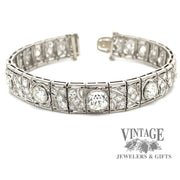 This sparkling vintage, circa 1900's, Edwardian diamond link bracelet is masterfully crafted in platinum. The bracelet contains ten large center diamonds, the center of which is an Old Mine Cut (OMC), flanked by the other nine larger Old European Cut (OEC) diamonds. The center OMC diamond is approx 1.35 carats and is an H color VS1 clarity. The two larger of the flanking diamonds are approximately 3/4 carats each, while the remaining 7 larger diamonds are approximately 1/4 carat each. Finally, each of the 30 links comprising the bracelet contain a combination of single and full cut diamonds that number 108. These satellite diamonds average 0.04 carats each, bringing the total diamond weight of the bracelet to approx. 9 carats. All the diamonds are average VS quality. The bracelet length is 6.75” and is secured with an integrated box catch and under-carriage safety.