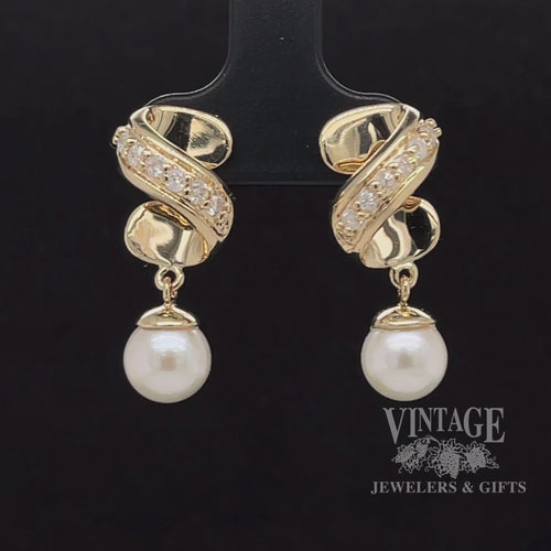 These estate 14 karat yellow gold contemporary pearl with diamond earrings present a contrast of the top "S" shaped portion of bright polish with the bright cut diamond middle section settings. The 6.4 mm Akoya pearls are set on post with a cap, and dangle with connected jump rings from the top section. The pearls have a pink rose' tone with light blemish and good lustre. The 6 round brilliant cut diamonds in each earring have an estimated total weight of .15 carats, each, or a total weight of .30 carats of Clarity I1 diamonds. The earrings are secured with friction post and nut.