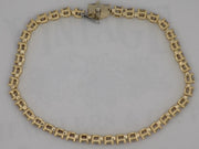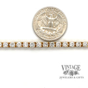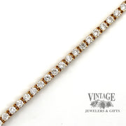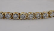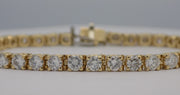 Estate 14 karat yellow gold round brilliant cut diamond "tennis" bracelet. The bracelet contains 40 natural diamonds with an estimated total weight of approximately 7 carats of SI diamonds. The bracelet is secured with a box catch with underneath clip safety.