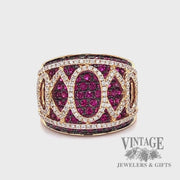 - 105 round rubies pave set inside of the ring. 1.575 carats total weight