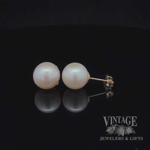 These 14k yellow gold South Sea cultured pearl earrings feature 11mm blemish-free white rose pearls with a moderate luster and cream white color with pink overtones. The friction posts and backs ensure a secure fit.
