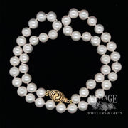 18" cultured pearl 8 X 8.5 mm estate necklace.  The strand contains 50 pearls strung knotted and secured with a 14 karat yellow gold fancy oval box style clasp. The Akoya pearls display a slight pink rose' tone with very light blemish and nice luster. They are well matched as to symmetry and roundness and have faint orient.