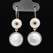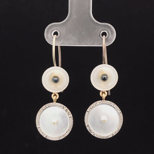 - Antique Mother of pearl, sapphire cabochon, disc drop earrings.