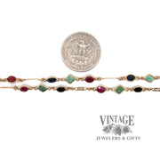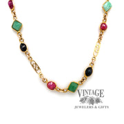 This 14 karat yellow gold 22" stone necklace contains a combination of sapphires, emeralds and rubies that are bezel set in a station necklace. The chain is secured with a harp style gold clasp.