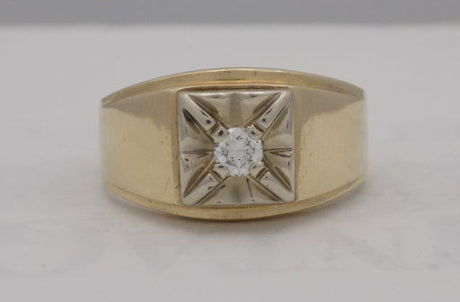 Solid rectangular textured 10k gold, diamond accented, estate signet ring. 1 round brilliant cut, colorless, VS clarity natural diamond accent, es...