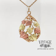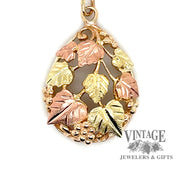 This pear shaped Black Hills Gold pendant consists four grape leaves in 12 karat green gold and 4 grape leaves in 12karat in pink gold. The leaves are mounted in the pear shaped yellow gold frame of 10 karat gold. The pendant is suspended from a yellow gold jump ring. Chain sold separately.
