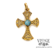 This 18 karat yellow gold cross has filigree designs with bright polished borders on all 4 sides. In the center, is a mottled blue cabochon stone. The cross is suspended from a solid detached bale.