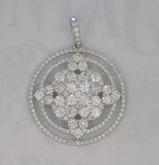 This circular cluster pendant has 170 sparkling natural diamonds micro pave set in 18k white gold for a total diamond weight of 1.75 carats. Average diamond color is G color, and VS clarity.