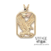 An elongated octagonal shadow box frames the well defined eagle in this 10 karat gold pendant. The pendant has the characteristic oak leaves beneath the bale, one in green gold the other in rose gold.