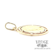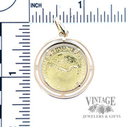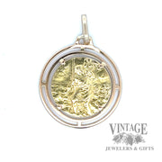 - 18 karat center medallion, XRF verified, secured in a 14 karat rose gold pendant frame.