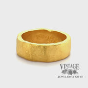 Hand forged here in our shop, this 24 karat gold, 7mm wide band, is not your traditional cookie cutter ring. With rustic imperfections of the forging process and matte satin finish showcasing the rich yellow color of the pure gold, no two rings are alike. Additionally as the ring ages, the soft properties of 24k gold means that the ring will develop its own unique wear patina, individualized to each person. It is currently a finger size 6.75.