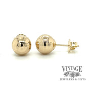 A pair of shimmering 14 karat yellow gold ball stud earrings. They are secured with a notched post and premium friction ear back.