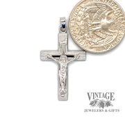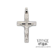 This distinctive 14 karat white gold crucifix is flat with ridges, has a slightly raised polished cross in the center and the Corpus on top of that. The cross measures 29 mm in length X 19 mm in width (1.14" X .75") and is suspended from a solid bale and jump ring. Chain sold separately.