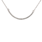 A petite 14 karat white gold diamond choker necklace with 27 round brilliant cut SI quality diamonds totaling .21 carats. They are prong set in a "smile" shape bar and suspended from a fine adjustable length cable chain secured with a lobster clasp. The necklace is 18" in length.