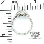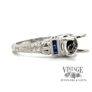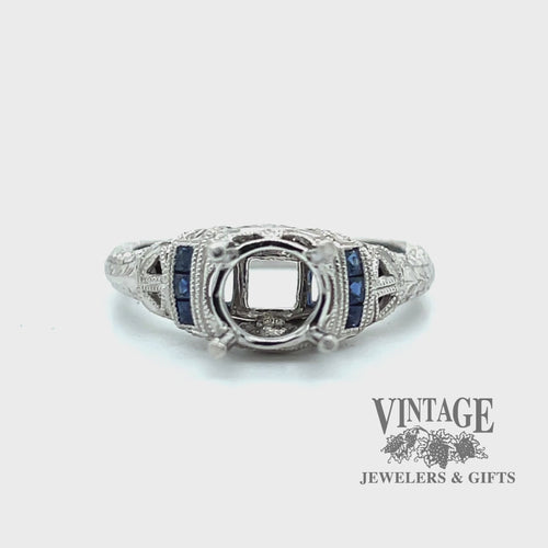 A show stopping vintage inspired sapphire and platinum ring! Designed to hold a 1 carat diamond, or 6.5 mm round center stone of your choice. With a total sapphire weight of .16 carats, the natural blue sapphires gorgeously compliment the meticulously hand engraved design. Currently a finger size 6.5.