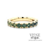 Candy apple green to teal! Expertly crafted in 14 karat yellow gold by the jewelers at Vintage Jewelers and Gifts, this ring stacker features a handset castle pave design and 10 round, ombré gradient, natural green, sea green and teal sapphires. Comfort fit, Finger size 7.25.