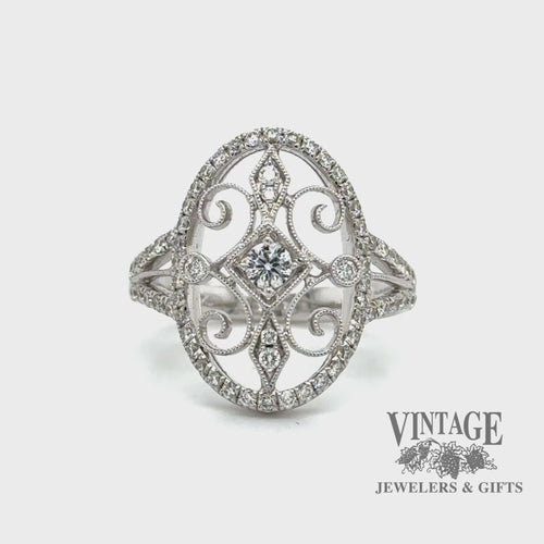 - 18 karat white gold diamond set oval halo with filigree center design.