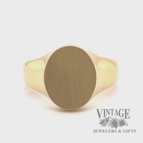 Expertly crafted by the Jewelers here at Vintage Jewelers and Gifts, this solid 14k yellow gold signet ring features an elegant satin finish, with a wide ring shank gracefully tapering up to a 15x12 mm oval flat top.