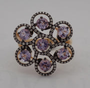 This 14k rose gold ring has six swirls radiating around a center swirl in a floral design.  In the center of each swirl, is prong set a 4 mm, lavender round amethyst. The swirls are bead set with 121 sparkling natural diamonds on a contrasting black rhodium background. The ring is now a size 6.5.