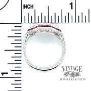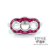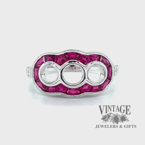 Vivid red caliber cut natural rubies frame the three round center stones of your choice in this 14 karat white gold vintage inspired ring. It is designed to hold 3 round bezel set stones that measure 3.5 mm (.17 carat round diamonds). The rubies have a total weight of 1.13 carats, with .04 carats of round, brilliant cut, VS Clarity accent diamonds. The shank of the ring is meticulously hand engraved with a wheat pattern. The ring is currently a size 6.5.