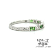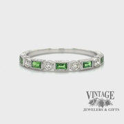 This ring features a band made of 14 karat white gold that has been hand engraved with a unique design. The band is adorned with alternating baguette-cut Tsavorites and round diamonds that have been bezel set with decorative mill-graining around the stones. The Tsavorites are a type of green gemstone that are known for their vibrant color and sparkling appearance. The round diamonds add a classic touch to the ring and add extra shine to the overall design. This ring would make a beautiful addition to any jewelry collection and would be perfect for those who love unique and elegant jewelry.