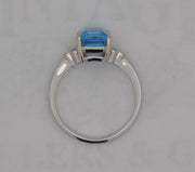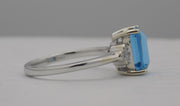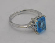 A 14k white gold ring holds this 2.70 carat, emerald cut, blue topaz center stone. Six bezel set accent diamonds (three to each side of the topaz) frame the topaz for .08 diamond ctw. The ring is now a size 7.