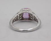 Ladies 14 karat white gold filigree style ring with pink sapphire. The radiant cut natural pink sapphire measures 7.95 mm in length X 4.875 mm in width for an actual weight of 0.98 carats. The filigree white gold mounting is a custom Vintage Jewelers & Gifts design. It is size 5.5.