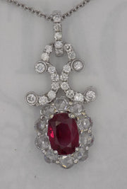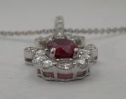 18 karat white gold natural oval ruby diamond pendant. The oval ruby weighs 1.09 carats while the diamonds in the halo are rose cut diamonds. The stylized bale hold round brilliant cuts and with both having a total weight of 0.75 carats. The "stylized" bale is of 2 "C"s back to back, with an inverted "U” below the pinpoint diamond straight bail. Chain sold separately.